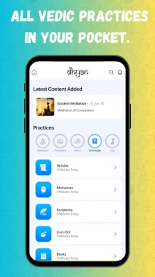 - Knowledge: Dhyan App aims to become a the most comprehensive source of books and literature on Vedic traditions. It features, text, audio and video articles. A unique scriptures section with a treasure trove of Vedic scriptures along with their chanting and interpretation. Large collection of books by saints, yogis, philosophers and scholars. Immerse yourself in motivational quotes by great saints. Talk to ancient gurus through our Guru bots.